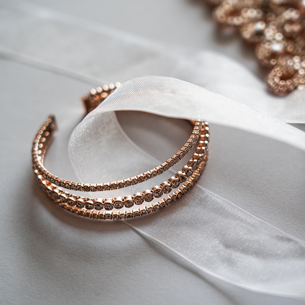 Deze prachtige 14k roségouden armband met kleine edelsteentjes straalt zowel moderne elegantie als luxe uit. Uitstekend te combineren met een horloge of andere sieraden.